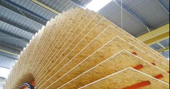 OSB板是以小徑材、間伐材、 木芯為原料,通過專用設備加工成長長的刨片(一般為40-100mm長、5-20 mm寬、0.3-0.7 mm厚),經脫油、干燥、施膠、定向鋪裝、熱壓成型等工藝制成的一種定向結構板材。